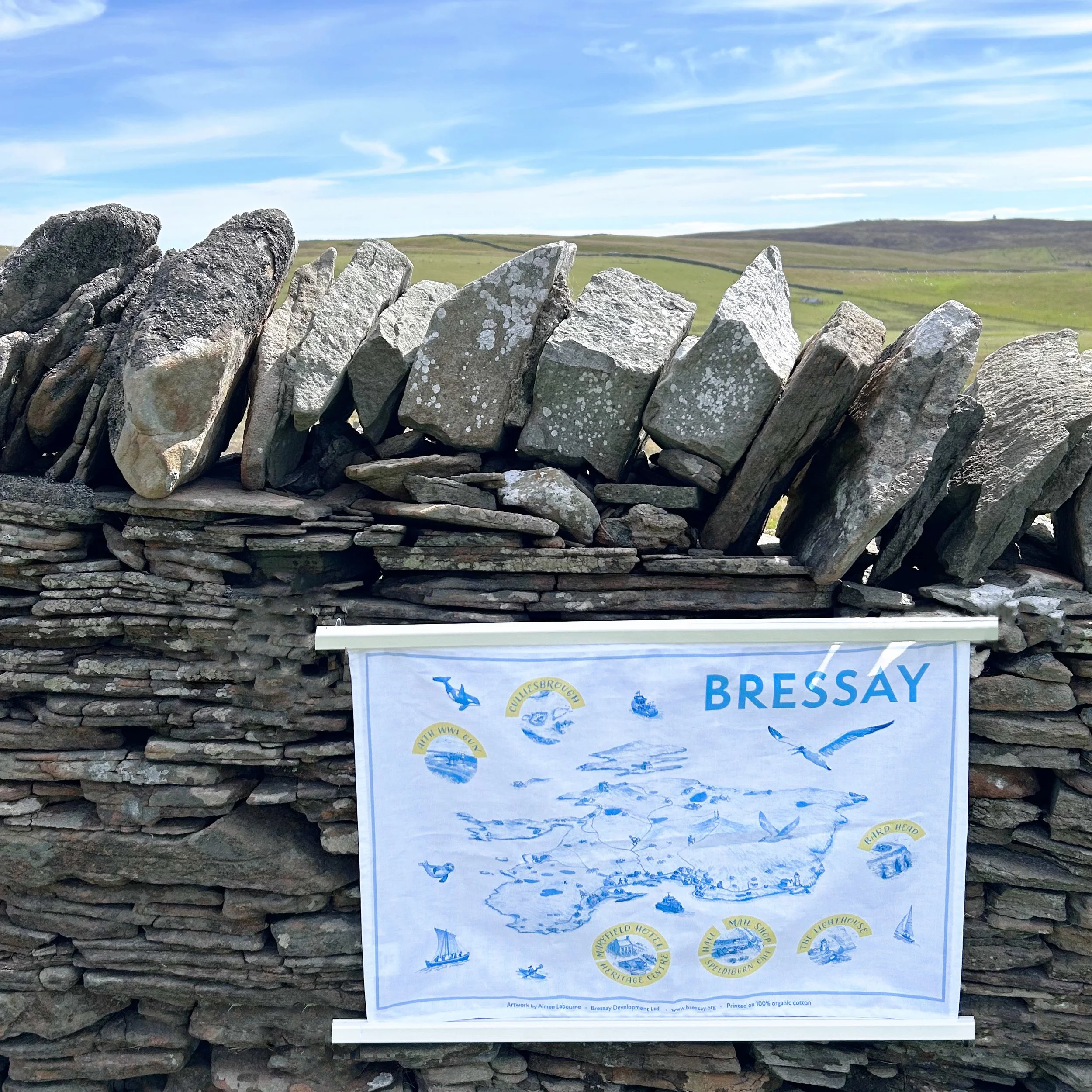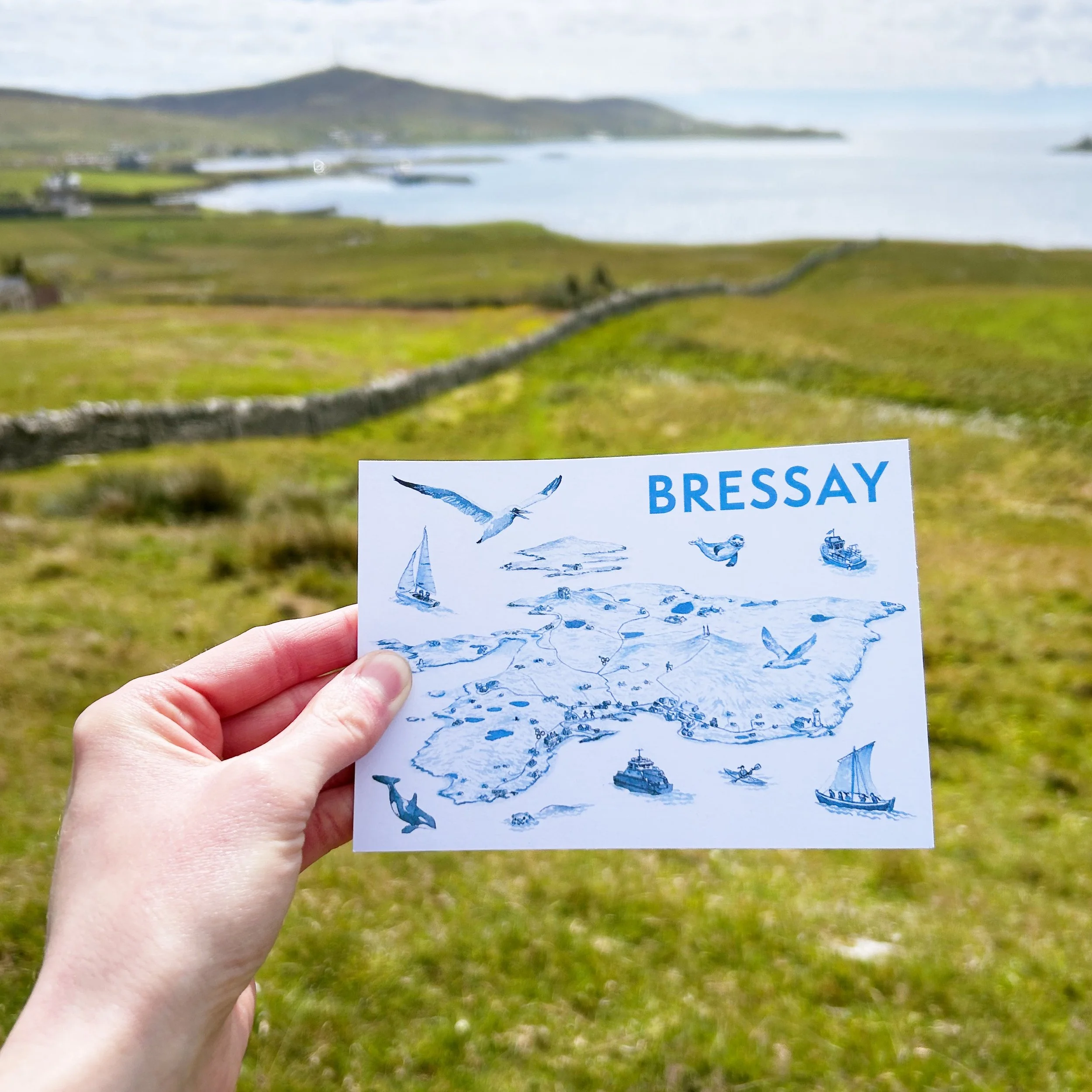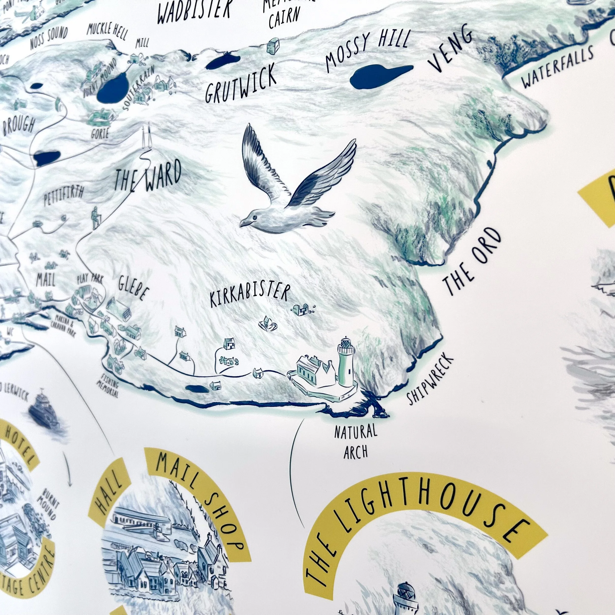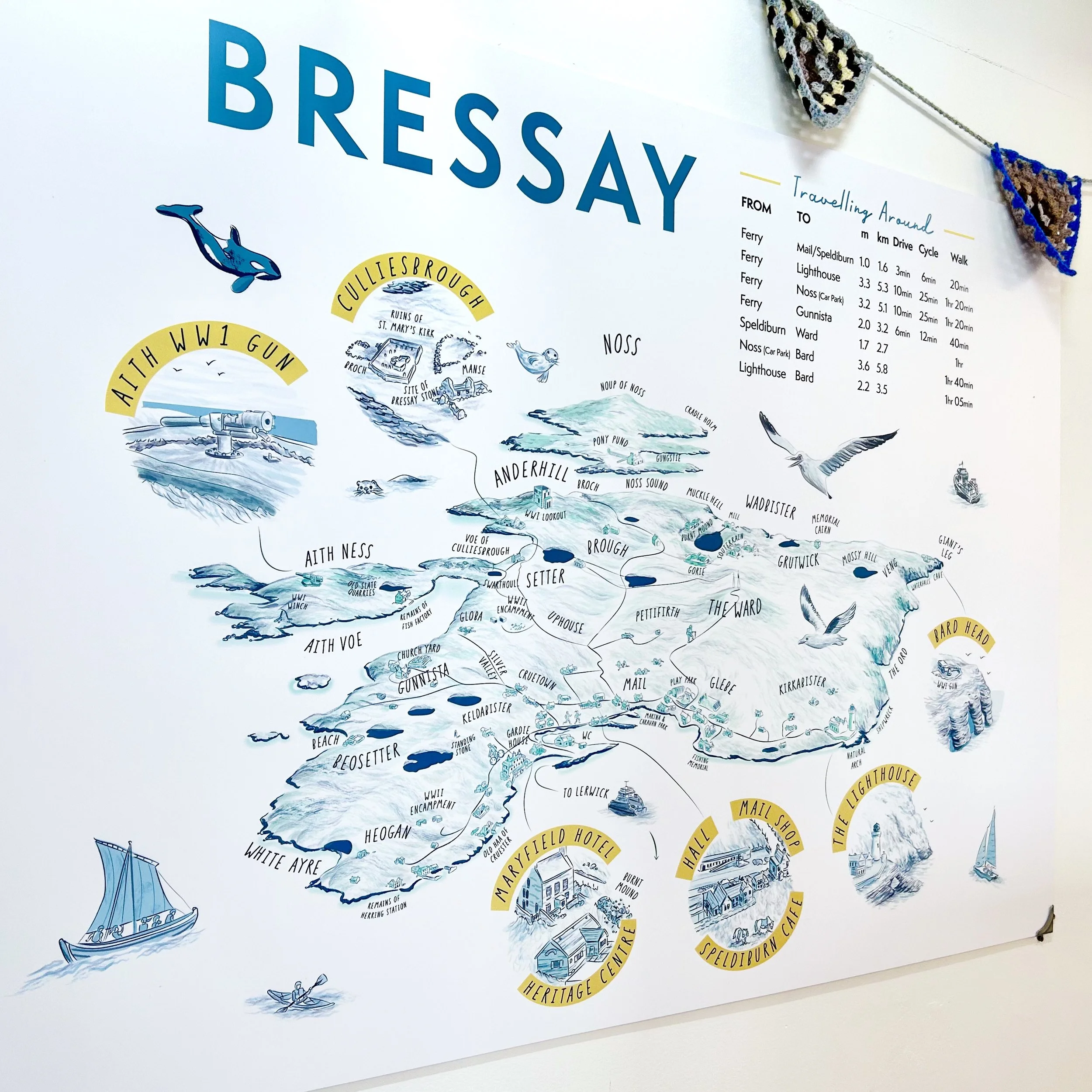 It was brilliant when Bressay's community development company, who I was volunteering with, saw this as something with potential for a postcard design. However, Covid coming along meant postcard-sending wasn't happening for a while. But during restrictions, we still worked behind the scenes, and I made an A0 digitally drawn version which was then printed for welcoming visitors back to Speldiburn Cafe and Community Hub. Historical sites and the island's community facilities were added, giving a sense of layers of stories and human-habitation through time, which continues today.