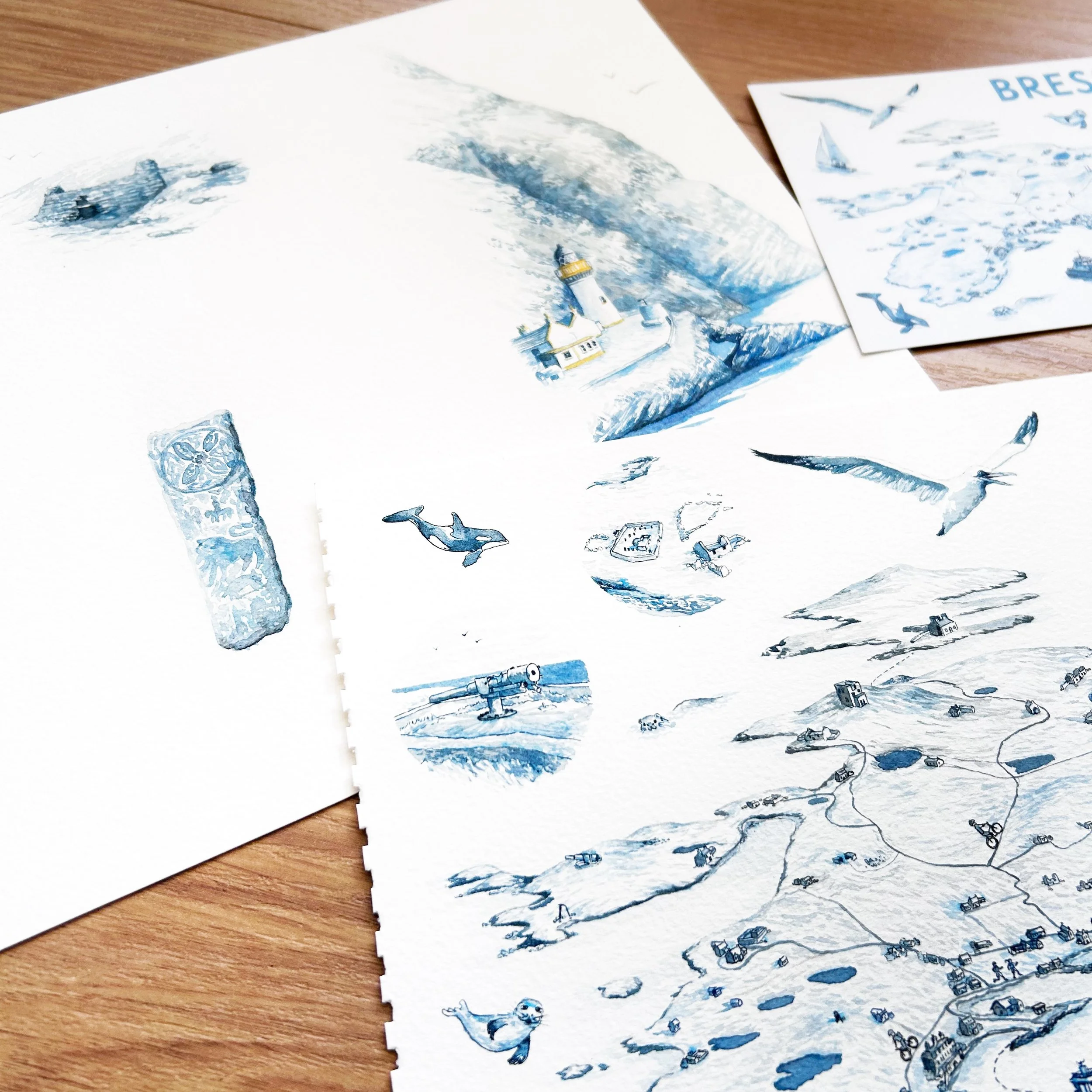 A short time before Covid, I made a map-like drawing of Bressay. It was a kind of aerial viewpoint of the island, as though looking east from mainland Shetland, but also a bringing-together of many of the island's special features and natural landmarks. Whilst drawing, I thought a lot about how the island is only a short journey from Lerwick, but is still a hidden gem, with a special character of its own - like a whole world in miniature.
